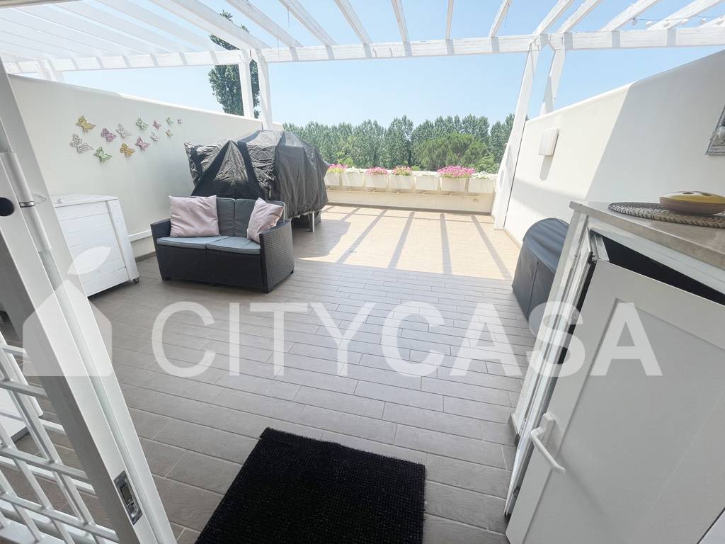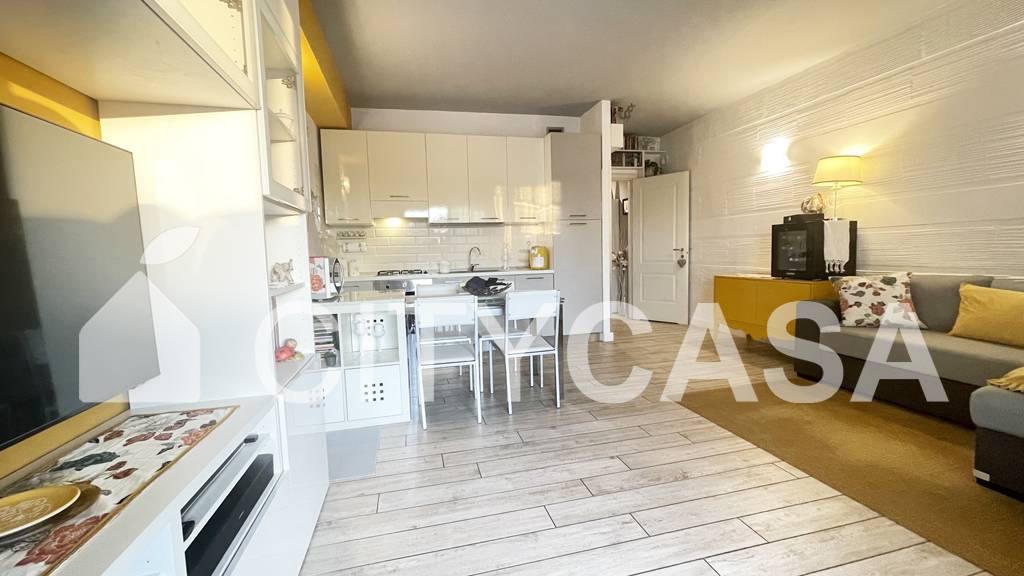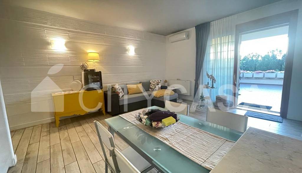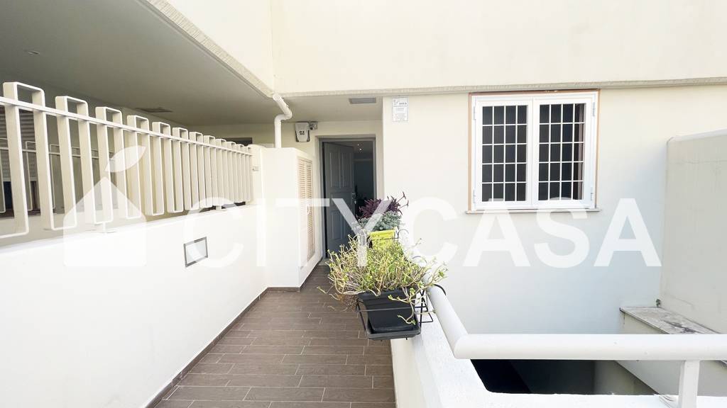 L'immobile, con Accesso Esterno indipendente che introduce alla proprietà tramite una piccola corte privata, dotata di giardinetto antistante l'Appartamento si trova al 2° piano, si compone di: Ingresso, Soggiorno con Cucina a Vista e accesso diretto al Terrazzo di Mq. 35 ca, Camera, Bagno con doccia. Completano la proprietà un Posto Auto Coperto di Mq.13 e una Cantina Asciutta di Mq. 3 nel Piano Seminterrato Condominiale, collegato direttamente dall'Ascensore.
