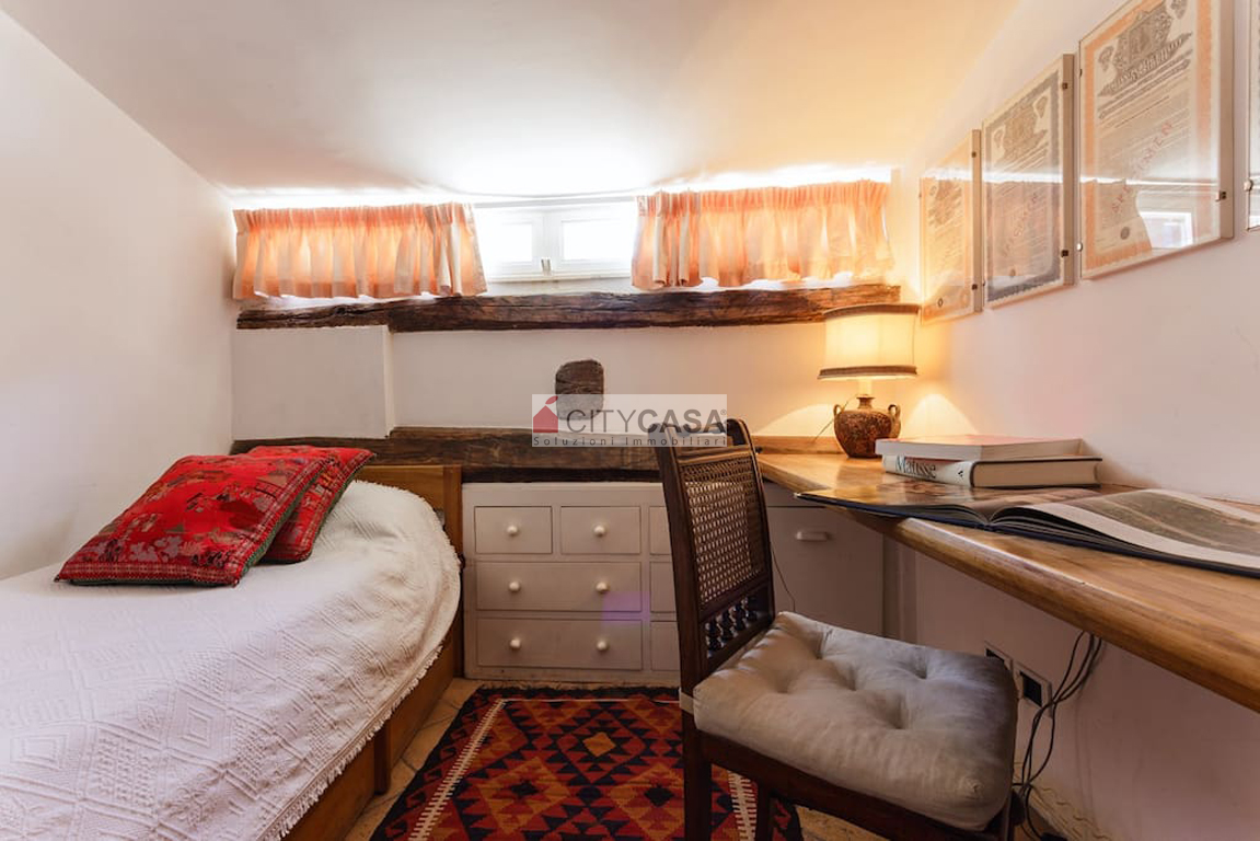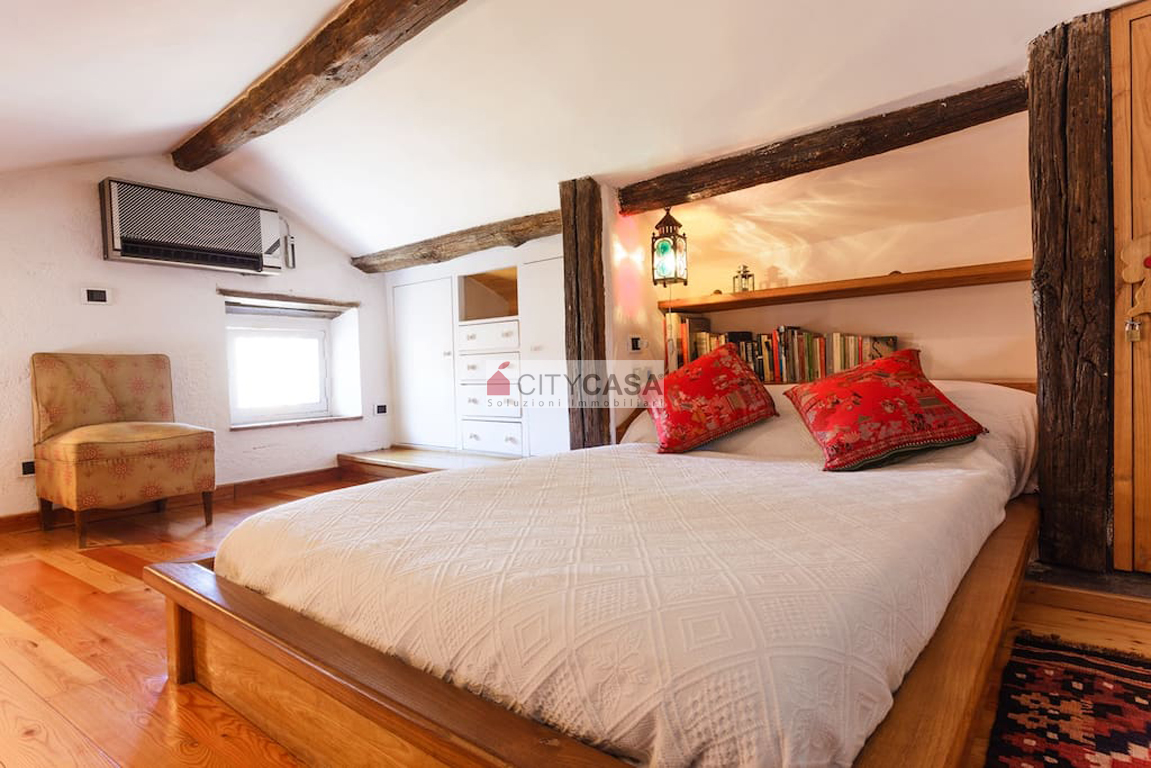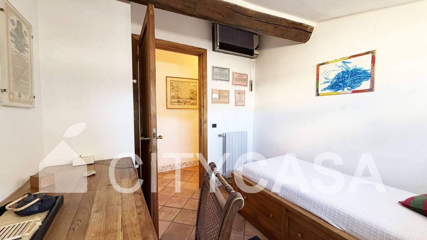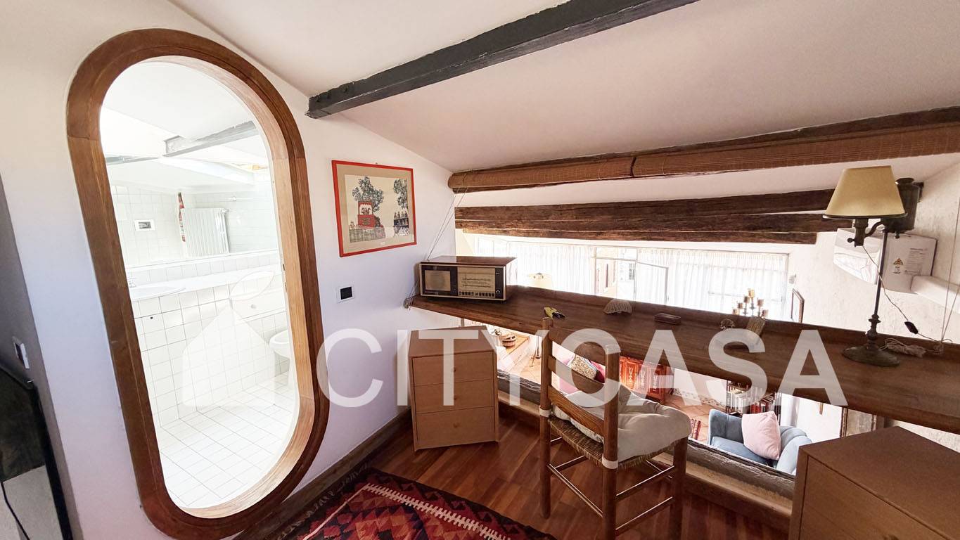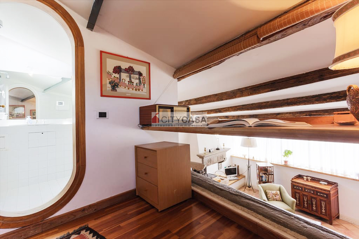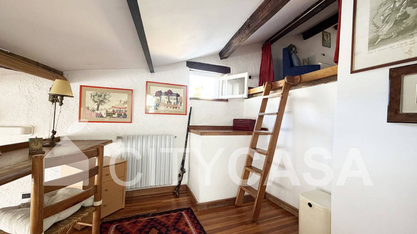 Al piano superiore vi troviamo una Zona Studio/Soppalcata, arredata con una grande scrivania e con affaccio sul Soggiorno. Vi è poi l`accesso alla terza Camera da letto (una Camera matrimoniale completa di poltrone e comodo armadio), con un Bagno attiguo dotato di box doccia.