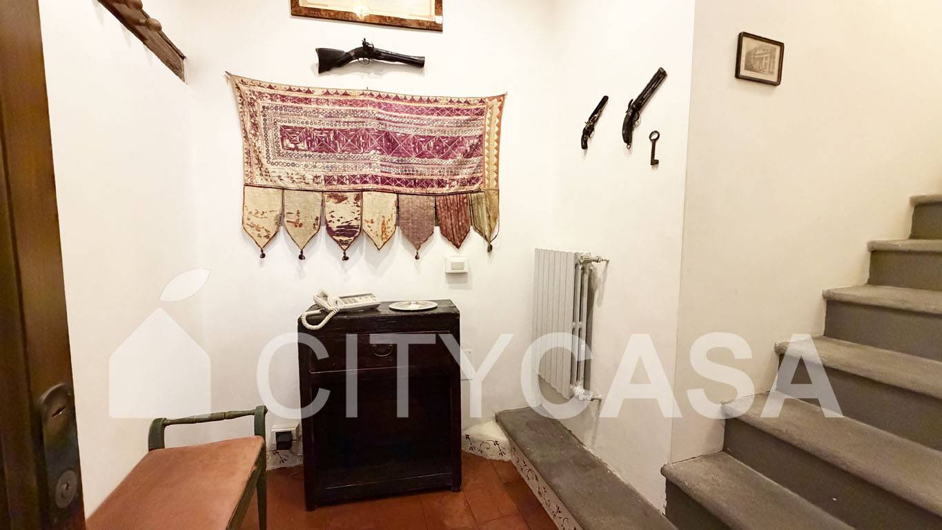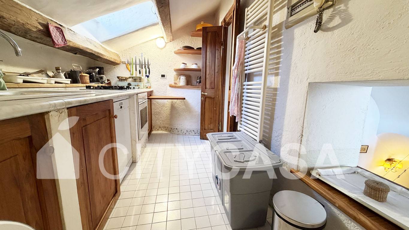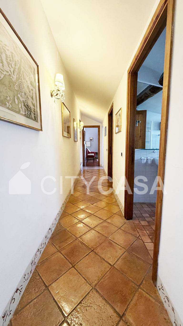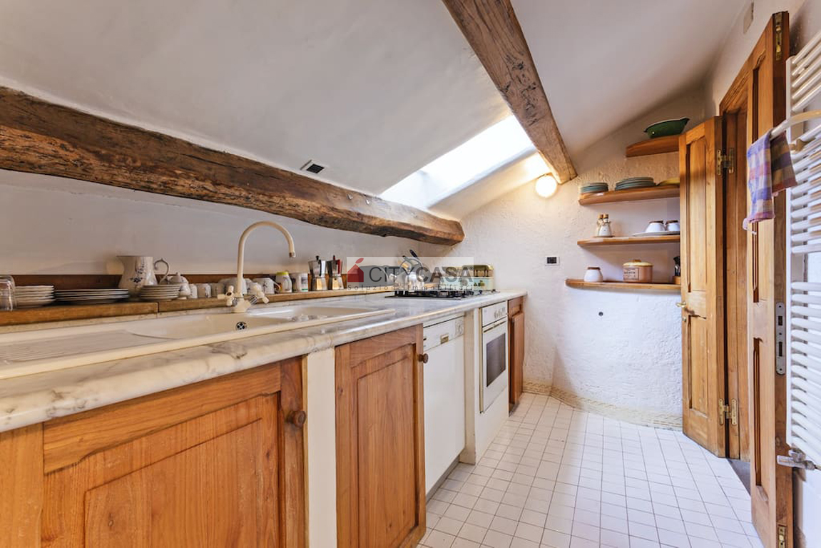 L'immobile è caratterizzato da un Bellissimo Pavimento in Cotto Fiorentino che ben si abbina alla Scala in Peperino grigio, Pietra Naturale tipica del posto, che conduce alla Cucina completamente attrezzata.