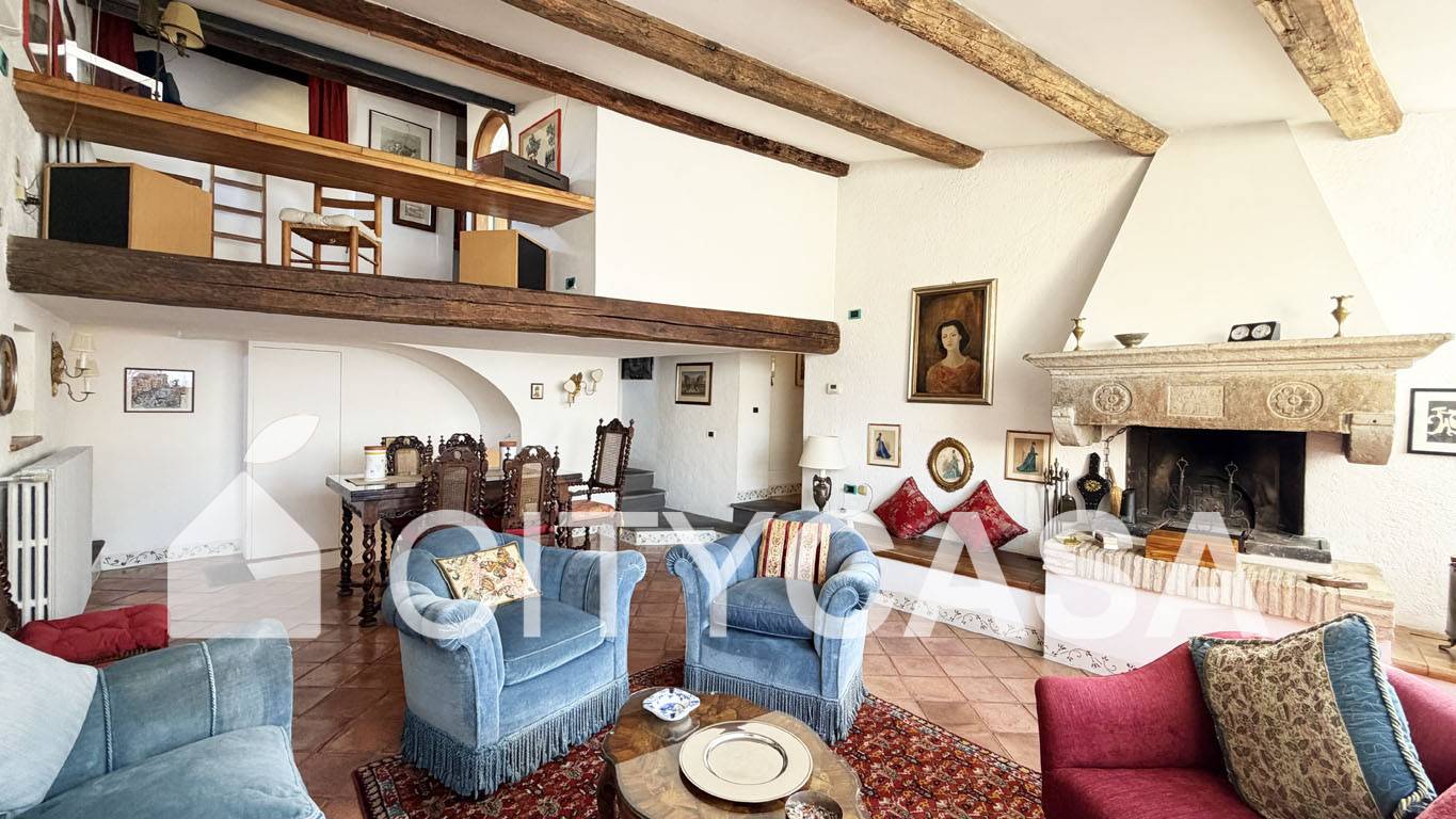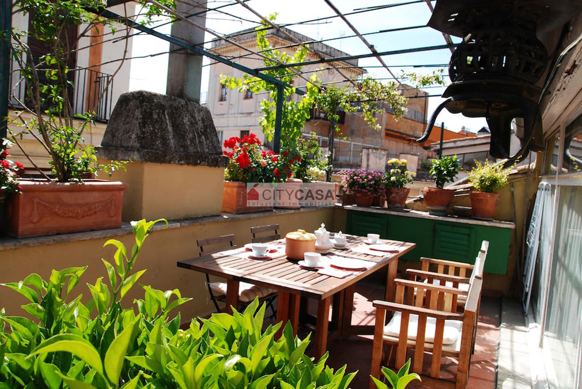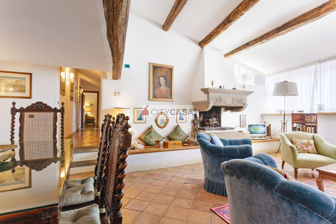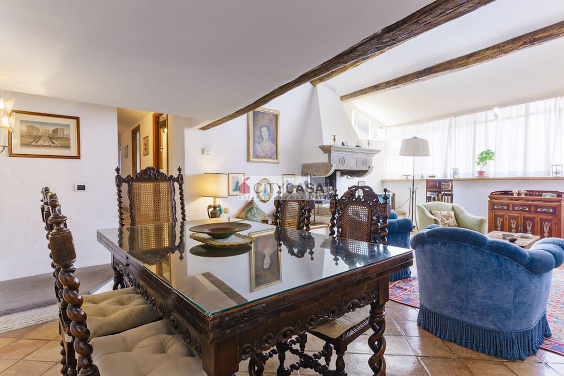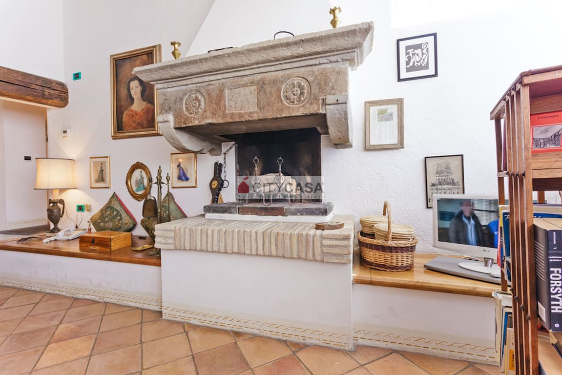 Aprendo la porta d`Ingresso, ci si trova in un ambiente accogliente, caratterizzato da una Scala in Peperino che dal quarto piano conduce al Soggiorno con Camino e Travi a vista, dando il Calore ed il Colore che contraddistinguono e rendono Unica questa Abitazione.